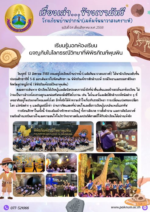 จดหมายข่าว กิจกรรม เรียนรู้นอกห้องเรียนผจญภัยในโลกธรณีวิทยาที่พิพิธภัณฑ์พุนพิน